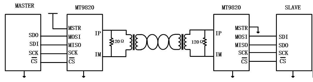 MT9820可通过单条双绞线连接在两个隔离器件之间提供双向SPI通信。每个MT9820将逻辑状态编码为信号,并跨越一个隔离势垒将信号传送至另一个MT9820。接收MT9820 对传输信号进行译码并把从总线驱动至适当的逻辑状态。隔离势垒可利用一个简单的脉冲变压器进行桥接,以实现几百伏的隔离度。